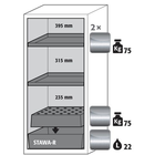 Veilige opslag, voldoet aan de geldende regelgeving voor gevaarlijke, ontvlambare producten in werkruimtes Robuust en duurzaam: stevige constructie aan de buitenzijde van brandwerende platen met een coating van melaminehars 3 bevestigingsscharnieren per deur, volledig sluitmechanisme en beveiligingselementen ter bescherming tegen corrosie, gemonteerd buiten de opslagruimte hoogwaardige deur, krasbestendig, met gestructureerd oppervlak met epoxy-coating Ergonomisch: de deur blijft in de stand staan bij het openen, automatische sluiting in geval van brand Gecontroleerd gebruik: vergrendelbare deur, compatibel met centrale vergrendeling Eenvoudig transport: geïntegreerde transportsokkel, eenvoudig afgewerkte plint of plint met 4 nivelleringsvoeten optioneel beschikbaar Beluchting en ontluchting: ingebouwd beluchtings- en ventilatiesysteem voor aansluiting (diameter 75 mm) op een technisch luchtafvoersysteem Getest en gecertificeerd conform de Amerikaanse norm FM 6050 Let op: wij raden aan om naast de kast ook de plint met verstelinrichting te bestellen. Hierdoor is het mogelijk om snel en veilig kleine oneffenheden in de vloer op te vangen, zodat de kast eenvoudig en zonder veel moeite kan worden versteld. Voor de technische ventilatie van de kast adviseren wij de ventilatiebox met geïntegreerde filtratie (zonder gaten in de muren te boren of afvoerleidingen naar buiten).
