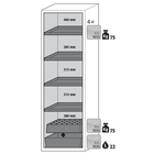 Veilige opslag, voldoet aan de geldende regelgeving voor gevaarlijke, ontvlambare producten in werkruimten Robuust en duurzaam: Stevige constructie aan de buitenzijde van brandwerende platen met een coating van melaminehars 3 bevestigingsscharnieren per deur, volledig sluitmechanisme en beveiligingselementen ter bescherming tegen corrosie, gemonteerd buiten de opslagruimte hoogwaardige deur, Krasbestendig, met gestructureerd oppervlak met epoxy-coating Ergonomisch: de deur blijft in de stand staan bij het openen, automatische sluiting in geval van brand Gecontroleerd gebruik: vergrendelbare deur, compatibel met centrale vergrendeling Eenvoudig transport: geïntegreerde transportsokkel, eenvoudig afgewerkte plint of plint met 4 nivelleringsvoeten optioneel beschikbaar Beluchting en ontluchting: ingebouwd beluchtings- en ventilatiesysteem voor aansluiting (diameter 75 mm) op een technisch luchtafvoersysteem Getest en gecertificeerd conform de Amerikaanse norm FM 6050 Let op: wij raden aan om naast de kast ook de plint met verstelinrichting te bestellen. Hierdoor is het mogelijk om snel en veilig kleine oneffenheden in de vloer op te vangen, zodat de kast eenvoudig en zonder veel moeite kan worden versteld. Voor de technische ventilatie van de kast adviseren wij de ventilatiebox met geïntegreerde filtratie (zonder gaten in de muren te boren of afvoerleidingen naar buiten).