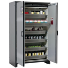 Veilige opslag, voldoet aan de geldende regelgeving voor gevaarlijke, ontvlambare producten in werkruimten Robuust en duurzaam: Stevige constructie aan de buitenzijde van brandwerende platen met een coating van melaminehars 3 bevestigingsscharnieren per deur, volledig sluitmechanisme en beveiligingselementen ter bescherming tegen corrosie, gemonteerd buiten de opslagruimte hoogwaardige deur, Krasbestendig, met gestructureerd oppervlak met epoxy-coating Ergonomisch: de deur blijft in de stand staan bij het openen, automatische sluiting in geval van brand Gecontroleerd gebruik: vergrendelbare deur, compatibel met centrale vergrendeling Eenvoudig transport: geïntegreerde transportsokkel, eenvoudig afgewerkte plint of plint met 4 nivelleringsvoeten optioneel beschikbaar Beluchting en ontluchting: ingebouwd beluchtings- en ventilatiesysteem voor aansluiting (diameter 75 mm) op een technisch luchtafvoersysteem Getest en gecertificeerd conform de Amerikaanse norm FM 6050 Let op: wij raden aan om naast de kast ook de plint met verstelinrichting te bestellen. Hierdoor is het mogelijk om snel en veilig kleine oneffenheden in de vloer op te vangen, zodat de kast eenvoudig en zonder veel moeite kan worden versteld. Voor de technische ventilatie van de kast adviseren wij de ventilatiebox met geïntegreerde filtratie (zonder gaten in de muren te boren of afvoerleidingen naar buiten).
