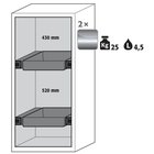 Veilige opslag, voldoet aan de geldende regelgeving voor gevaarlijke, ontvlambare producten in werkruimten Robuust en duurzaam: Stevige constructie aan de buitenzijde van brandwerende platen met een coating van melaminehars 3 bevestigingsscharnieren per deur, volledig sluitmechanisme en beveiligingselementen ter bescherming tegen corrosie, gemonteerd buiten de opslagruimte hoogwaardige deur, Krasbestendig, met gestructureerd oppervlak met epoxy-coating Ergonomisch: de deur blijft in de stand staan bij het openen, automatische sluiting in geval van brand Gecontroleerd gebruik: vergrendelbare deur, compatibel met centrale vergrendeling Eenvoudig transport: geïntegreerde transportsokkel, eenvoudig afgewerkte plint of plint met 4 nivelleringsvoeten optioneel beschikbaar Beluchting en ontluchting: ingebouwd beluchtings- en ventilatiesysteem voor aansluiting (diameter 75 mm) op een technisch luchtafvoersysteem Getest en gecertificeerd conform de Amerikaanse norm FM 6050 Let op: wij raden aan om naast de kast ook de plint met verstelinrichting te bestellen. Hierdoor is het mogelijk om snel en veilig kleine oneffenheden in de vloer op te vangen, zodat de kast eenvoudig en zonder veel moeite kan worden versteld. Voor de technische ventilatie van de kast adviseren wij de ventilatiebox met geïntegreerde filtratie (zonder gaten in de muren te boren of afvoerleidingen naar buiten).