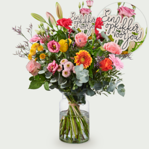 Een royaal boeket waarmee je pas echt uitpakt! Dit boeket heeft een houten steker met de tekst 'Een opkikker voor jou'