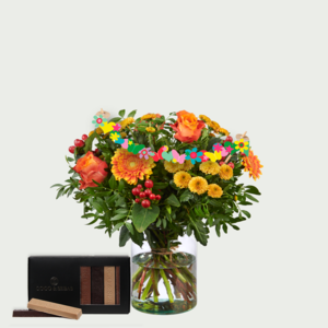 Wil jij iemand opvrolijken? Dit boeket heeft een vrolijke slinger en bevat ook nog eens lekkere chocoladereepjes in de smaken puur-melk-karamel zeezout. Daar wordt toch iedereen vrolijk van?!