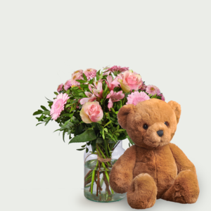 Roze, roze, roze... Boeket Nola is een perfect boeket als er een meisje is geboren. Samen met deze lieve knuffelbeer heb je een cadeau voor de dochter en de ouders in één. Leuk om te laten bezorgen na de geboorte.