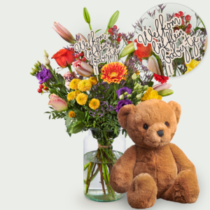 Met deze prachtige kleurencombinatie fleurt iedere plek in huis op. Zo kan de ontvanger optimaal genieten van het zwangerschapsverlof. Voor de baby is er een knuffelbeer, zo is iedereen verrast!
