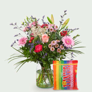 Iedere bloem en kleur heeft zijn eigen betekenis. Zie je die donker roze anjer? De anjer staat symbool voor hartstocht, verlangen en romantiek en de donker roze tint voor dankbaarheid. Dat maakt dit boeket met steker 'Super bedankt' en de vrolijke Tiny Tony's mix hét perfecte cadeau om de ontvanger mee te bedanken.
