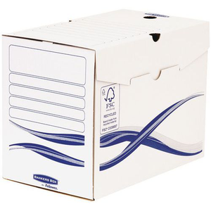 Archiefdoos Bankers Box Basic A4+, Rugbreedte: 20 cm, Materiaal: Karton, Kleur: Blauw/wit, Totale lengte: 101 cm, Totale hoogte: 74.2 cm, Brandveiligheid: M4, Totale breedte: 4 cm, Recyclebaar product: Ja - 100%, Gerecycled product: 100 %, Eco-verantwoordelijke aanpak: ja, Voor formaat: A4+, FSC licentie: ja