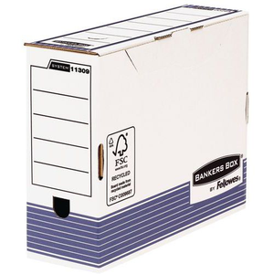 Automatische archiefdoos Bankers Box A4+, Rugbreedte: 10 cm, Materiaal: Karton, Kleur: Blauw/wit, Totale lengte: 24.9 cm, Totale hoogte: 34.5 cm, Brandveiligheid: M4, Totale breedte: 10 cm, Recyclebaar product: Ja - 100%, Eco-verantwoordelijke aanpak: ja, Voor formaat: A4+, Model: Rug van 10 cm, Verpakking: Set van 10, FSC licentie: ja