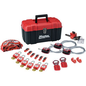 De elektrische lockout- en kleppengereedschapskist nr. S1117VES31KA van Master Lock bevat verschillende elektrische en klepvergrendelingsaccessoires en 6 Zenex™ S31 gelijksluitende, thermoplastische hangsloten, opgeborgen in een draagbare gereedschapskist die met een hangslot kan worden afgesloten. Inbegrepen zijn: de S1017 gereedschapskist, 6 S31KARED hangsloten, 3 S806 kabels, 2 420 haken, 3 klepvergrendelingssystemen, 480, 481 en 482, 1 S3068 handgreepvergrendelingssysteem voor kwartslagkleppen, 6 S2390 standaard ministroomonderbrekerblokken, 2 S2393 universele ministroomonderbrekerblokken.