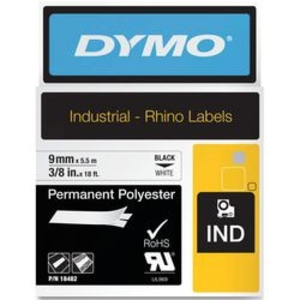DYMO Permanente polyestertape Rhino. Voor het etiketteren van panelen, blokken, plateaus, rekken, bakken en balken. Geschikt voor de volgende DYMO apparaten: Rhino 4200, 5000, 5200, 6000, ILP 219. Afmetingen: 9 mm x 5,5 m (BxL). Kleur: Zwart, wit.