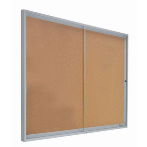 Binnenvitrine met schuifdeuren, Aantal vellen A4: 10, Lean Management: ja, Bodem materiaal: Kurk, Magnetisch: nee, Deurmateriaal: Plexiglas, Deur openingstype: Schuifdeur, Aantal deuren: 2, Hoogte: 68 cm, Breedte: 116 cm, Nuttige dikte: 1 cm, Totale dikte: 3.4 cm, Type: Deur van plexiglas, Kleur: Grijs, Lijst materiaal: Aluminium, Gebruiksomgeving: Binnen, Recyclebare verpakking: Ja - 100%