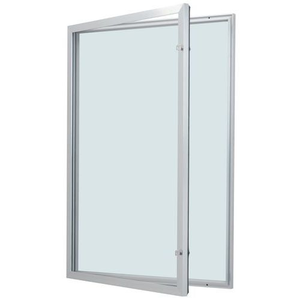 Ruimtebesparende vitrine met ingebouwd verchroomd slot om uw gegevens buiten te presenteren. Handig: de metalen achterwand is magnetisch, zodat u documenten met magneten kunt plaatsen. Zilverkleurig frame van geanodiseerd aluminium voor een moderne en mooie uitstraling. Sluiting met veiligheidsslot en deur van veiligheidsglas (dikte 5 mm) voor de veiligheid van uw documenten. Voorzien van een afdichting voor optimale waterdichtheid. Wandmontage of losstaand op kolom. Vitrine met verschillend slot. Bestaat ook in een uitvoering met identiek slot.