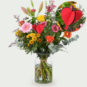 Trouwerijboeket Jana is met haar fleurige combinatie en rode bijstekers een welkome verrassing voor een kersvers bruidspaar of een stel dat hun jubileum viert.