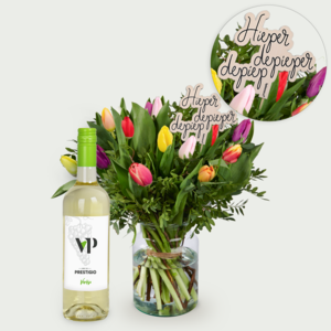 combideal: witte wijn en steker hieperdepiep. Gemengdt tulpen boeket