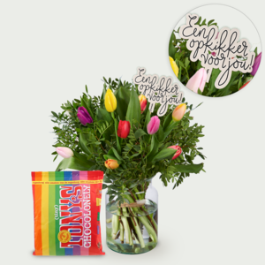 Verras iemand die wel een opkikker kan gebruiken met dit vrolijke tulpenboeket Talitha. De frisse mix van rode, gele, roze en paarse tulpen zorgt voor een kleurrijke oppepper. De bijgeleverde ‘Een opkikker voor jou’ steker voegt een extra lieve boodschap toe, terwijl het zakje Tiny Tony's chocolaatjes van Tony's Chocolonely het gebaar nog zoeter maakt. Perfect om iemand een hartverwarmende beterschapswens mee te sturen!    Waarom kiezen voor Topbloemen.nl?  • 7 dagen versgarantie  • Bezorging op dezelfde dag mogelijk  • Breed aanbod verse bloemen  • Gemakkelijk online bestellen    De exacte samenstelling van het boeket is afhankelijk van de beschikbaarheid van de bloemen.