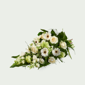 Dit rouwboeket met witte bloemen en groene bladeren heeft een elegante, maar zachte uitstraling. Let op: dit rouwboeket heeft geen eigen watervoorziening. Doordat deze droog bij de plechtigheden ligt heeft het boeket een beperkte houdbaarheid. Het boeket wordt bezorgd op water zodat de bloemen tot de condoleance of uitvaart mooi blijven. Liever een rouwstuk met langere houdbaarheid? Bekijk dan onze andere rouwbloemen mét watervoorziening. Dankzij de speciale steekschuimhouder met water kan langere houdbaarheid worden gegarandeerd. Heb je speciale wensen? Neem dan contact op met onze klantenservice.
