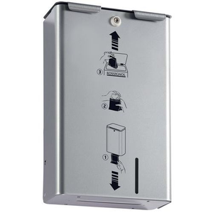 Staal met anti-uv-coating Deksel met plastic stootrand Vergrendeling via sleutel Voorkant opening en automatische blocage bij opening : eenvoudige herbevoorrading Geïntegreerde zak beugels Zakjeshouder uitneembaar Voor 100 zakjes voor dameshygiëne (Femina ref. A371840)