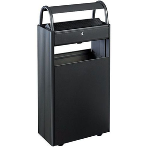 Asbak-prullenbak op voet. Beugels voor de vuilniszakophanging. Driehoekig sleutelslot.