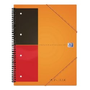 Oxford International notitieboek. Harde kunststof kaft. Formaat: A5+. Voorzien van dubbele spiraal, 80 uitscheurbare vellen met 4-gaats perforatie. Met 3 kleppen achterin voor het opbergen van losse documenten. Compleet met elastosluiting. Papiergewicht: 80 g/m². Extra wit papier. Gladde oppervlakte. Kaft kleur: zwart, oranje, rood.