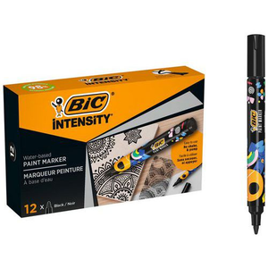 Paintmarker BIC Intensity, schrijft op diverse oppervlakken, heeft een lange levensduur, en de grote afmetingen van het reservoir garanderen een lange gebruiksduur. Voeg eenvoudig levendige kleuren toe aan uw doe-het-zelfprojecten, met de BIC Intensity-lakstiften. Schudden en pompen zijn niet nodig, zodat u ze snel en eenvoudig kunt gebruiken. Set van 12 zwarte, niet-giftige lakstiften, voor 98% gemaakt van gerecycled materiaal (met uitzondering van het inktsysteem). Goede dekking: de acrylinkt op waterbasis dekt goed op zowel transparante als opake oppervlakken.