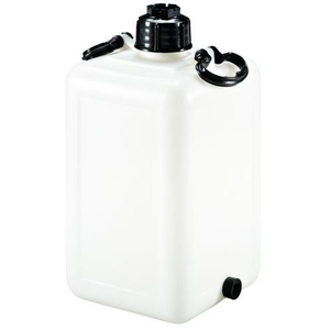 Jerrycan met aftapplug, Totale inhoud: 20 L, Kleur: Wit, Lengte: 250 mm, Breedte: 250 mm, Hoogte: 450 mm, Materiaal: Polyethyleen van hoge dichtheid, Gewicht: 1.5 kg, Uitwendige opening Ø: 55 mm, Special Covid-19: nee, Recyclebare verpakking: Ja - 100%, Recyclebaar product: Ja - 100%, Gebruik voor voedsel: ja