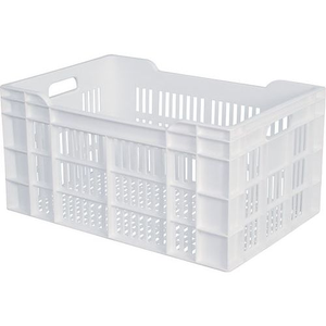 Euronorm-bak met geperforeerde wanden en bodem, Totale inhoud: 60 L, Stapelbaar: ja, Totale hoogte: 300 mm, Totale breedte: 400 mm, Totale lengte: 600 mm, Euronorm-bak inhoud (Reeks): Groot (41 - 175 L), Type zijkant: Geperforeerd, Gebruik voor voedsel: ja, Bak kleur: Wit, Type bodem: Geperforeerd, Materiaal: Polyethyleen van hoge dichtheid, Nestbaar: nee, Nuttige breedte: 370 mm, Recyclebare verpakking: Ja - 100%, Recyclebaar product: Ja - 100%, Gewicht: 2.45 kg, Stapelbaar: ja, Min. gebruikstemperatuur: -40 °C, Max. gebruikstemperatuur: 90 °C, Nuttige hoogte: 265 mm, Nuttige lengte: 570 mm