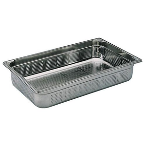 Bodem en zijkanten geperforeerd, voor bereiding met stoom en aftappen. (1) Geperforeerde bodem (2) Geperforeerde bodem en zijkanten. Gastronormbakken: Modulaire bewaarbakken van roestvrij staal. Afmetingen aangepast aan internationale gestandaardiseerde normen voor keukengerei NF 631-1. Geschikt voor het bereiden, koken, invriezen, opwarmen en uitserveren van maaltijden. Randen en hoeken zijn verstevigd om vervorming te voorkomen. Onze bakken van rvs zijn compatibel met de deksels van ons assortiment 'Cristal'.