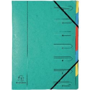 Exacompta sorteermap 54073E. Vakken: 7. Materiaal: glanskarton. Kwaliteit: 400 g/m2. Binnenzijde: gerecycleerd gekleurd karton. Kenmerken: uitrekbare rug met elastieken en bedrukte vensters. Sluiting: elastieken. Formaat: A4. Kleur: groen.