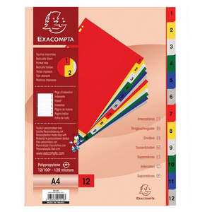 Tabblad 20 st. gekleurde pp 12 tabs 1 tot 12 A4 Exacompta, Aantal tabs: 12, Kleur: Diverse, Voor formaat: 210 x 297 mm (A4), Materiaal: Polypropyleen, Recyclebaar product: Ja - 100%