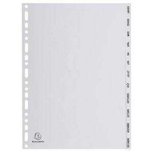 Tabblad bedrukt tabs grijs pp 12 tabs jan/dec A4 Exacompta, Aantal tabs: 12, Kleur: Grijs, Voor formaat: 210 x 297 mm (A4), Materiaal: Polypropyleen, Recyclebaar product: Ja - 100%, Gerecycled product: 100 %, Eco-verantwoordelijke aanpak: ja