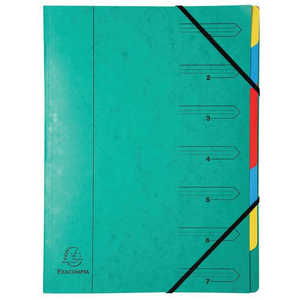 Sorteermap vast rug elastosluiting 7 indelingen Exacompta, Aantal tabs: 7, Kleur: Groen, Breedte: 24.5 cm, Gramsgewicht: 400 g/m², Eco-verantwoordelijke aanpak: ja, Kaft materiaal: Karton, Model: Gestikte sorteermap met elastieken, FSC licentie: ja