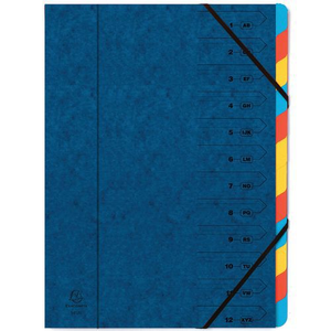 Sorteermap vast rug elastosluiting 12 indelingen Exacompta, Aantal tabs: 12, Kleur: Blauw, Breedte: 24.5 cm, Gramsgewicht: 400 g/m², Eco-verantwoordelijke aanpak: ja, Kaft materiaal: Karton, Model: Gestikte sorteermap met elastieken, FSC licentie: ja