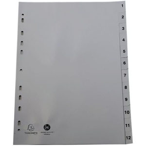 Tabblad met bedrukte tabs, Aantal tabs: 20, Kleur: Grijs, Voor formaat: 210 x 297 mm (A4), Materiaal: Polypropyleen, Gramsgewicht: 160 g/m², Materiaal: Gerecycled polypropyleen, VOC-vrij: ja, Selectie telewerken: ja, Recyclebaar product: Ja - 100%, Gerecycled product: 100 %, Eco-verantwoordelijke aanpak: ja, Model: 1912E