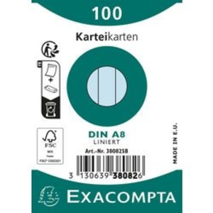 Exacompta Indexkaarten 38082SB. 2. Number per UOM: 48. 4. Inhoud: 100. 5. Inhoud Eenheid: Vellen. Basis productkleur: Blauw. Breedte: 55 mm. Diepte: 74 mm. Gewicht: 72 g. Hoogte: 23 mm. Kleur: Hemelsblauw. Merk: Exacompta. Model: 38082SB. Producttype: Indexkaarten. Voor Formaat: A8.