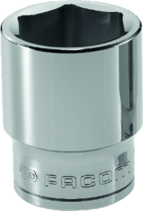 Facom dop voor zeskantmoeren, aansluitmaat 1/2", lengte 36mm, sleutelwijdte 19mm, sleuteldiepte 14mm, oppervlaktebescherming verchroomd, gewicht 69g, norm ISO2725-1/1711-1.DIN3124