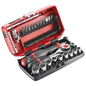 Bevat: 1 x 1/4 ratel met draaibare handgreep: R. 360. 10 x 1/4 12-kant doppen in inches: R. 7/32 - 1/4 - 9/32 - 5/16 - 11/32 - 3/8 - 13/32 - 7/16 - 1/2 - 9/16. 2 x standaard 1/4 verlengstukken: L 55mm (R. 209) - L 100m (R. 210). 1 x 1/4 cardanas: R. 240A. 1 x 1/4 kort handvat schroevendraaier: R. 236C. 1 x 1/4 bithouder met standaard borgring: R. 235. 1 x 1/4 zeskant mofhouder - 1/4 vierkant: ECR. 11 x serie 1 bits - 1/4 aandrijving - 6,35mm - L 25mm : - ES. T voor sleufschroeven : 4,5 - 6,5 - 8mm. - ED. T voor Posidriv schroeven : PZ1 - PZ2 - PZ3. - EH. voor inbusschroeven: 1/4 - 1/8 - 3/16 - 5/32 - 7/32. Lege doos: BV. RNANO-U. Gewicht: 0,850 kg.