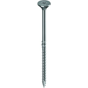Houtconstructie schroef. Verzonken kop: met inkepingen onder de kop. Dubbele conische kop: versterkt de kracht van de kop. karteling: vermindert de schroefinspanning en de opwarming van de schroef. Diepe schroefdraad: scheurbestendig. Speciale schroefdraad: maakt sneller inschroeven mogelijk. Snijpunt: voorkomt houtsplijten en verbetert de schroefaanzet.