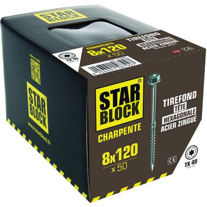 Schroef met zeskantkop Tirefond Torx . Diepe uitsparing om de bit stevig vast te houden. Kan worden ingedraaid met een inbus voor doeltreffender aandraaien. De karteling vermindert de schroefinspanning en beperkt de opwarming van de schroef. Gekartelde punt voorkomt houtsplijten.