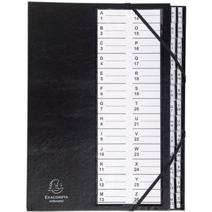 Sorteermap Ordonator met alfabetisch plastic ruiters A tot Z Exacompta, Aantal tabs: 26, Kleur: Zwart, Hoogte: 33 cm, Breedte: 25 cm, Gramsgewicht: 300 g/m², Eco-verantwoordelijke aanpak: ja, Kaft materiaal: Karton, Model: Sorteermap harde Ordonator, FSC licentie: ja