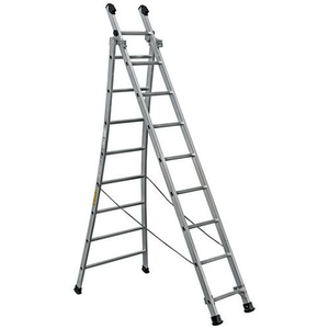 Reformladder met wijduitlopende basis, Materiaal: Aluminium, Opengeklapte hoogte: 4.4 m, Werkhoogte opengeklapt: 5.3 m, Aantal delen: 2, Aantal treden: 8+9, Ingeklapte hoogte: 2.7 m, Leunladder hoogte: 4.2 m, Werkhoogte ingeklapt: 3.6 m, Lengte vloeroppervlak: 1.77 m, Breedte vloeroppervlak: 0.87 m, Lengte trede: 303 mm, Breedte trede: 25.5 mm, Max. belasting: 150 kg, Certificering: Frans decreet 96-333, Hoogte tussen 2 treden: 280 mm, Gewicht: 11 kg, NF: nee