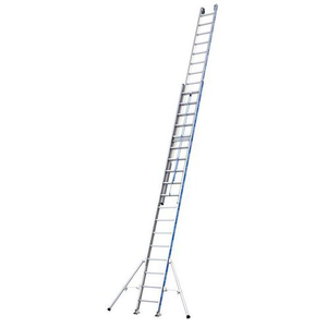 Grote hoogte, speciaal voor dakwerkers en aanplakkers 3-delige schuifladder, eenvoudig te verplaatsen. Onbreekbare vergrendelingskantelaar van aluminium met automatische terugstelling, voor soepel en moeiteloos verplaatsen. Verwisselbare draaibare stalen voeten met soepele bekleding. Automatische vergrendeling van het schuivende deel. De delen schuiven over sleden van polyamide, dus geen risico op vastlopen.