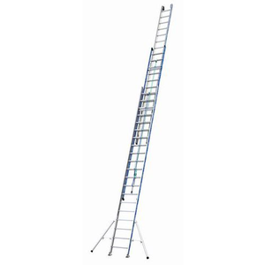 Grote hoogte, speciaal voor dakwerkers en aanplakkers 3-delige schuifladder, eenvoudig te verplaatsen. Onbreekbare vergrendelingskantelaar van aluminium met automatische terugstelling, voor soepel en moeiteloos verplaatsen. Verwisselbare draaibare stalen voeten met soepele bekleding. Automatische vergrendeling van het schuivende deel. De delen schuiven over sleden van polyamide, dus geen risico op vastlopen.