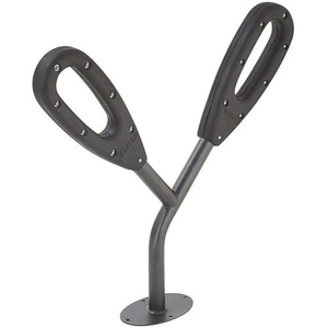 Paal voor 2 fietsen, vlindermodel. Met 2 rubberen ringen voor een maximale bescherming van de fietsen. Elke fiets wordt perfect gemonteerd op 2 rubberen blokken om krassen op de lak te voorkomen. Met 2 ringen voor bevestiging van een antidiefstalkabel of, nog beter, een fietsslot in U-vorm.