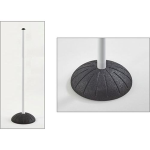 Sokkel van zwart gerecycled rubber. Met zwarte afsluitdop zonder haak. Paal van wit gepoederd aluminium, buis Ø 50 mm. Totale hoogte: 1500 mm. Voet Ø 360 mm en hoogte 105 mm. Sokkel van rubber die schokken absorbeert. Onvervormbaar. Zeer goede grip op de vloer, windbestendig 145 km/h. Zeer goede stabiliteit: cup van 6,50 kg.