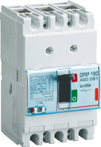 Legrand LEXIC DPX3 vermogensschakelaar, 3 polen, nom. continustroom Iu 25A, positie aansluiting hoofdstroomcirc voorzijde, compleet apparaat incl. beveiliging, omegarailmontage optioneel, uitvoering van het bedieningselemen draaigreep, apparaatbouwvorm inbouwapparaat vaste inb.,