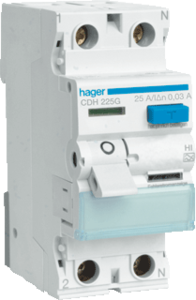 Hager High Immunity aardlekschakelaar 1, 2 polen, type lekstroom overig, DIN-rail, nom. (meet)stroom 25A, nom. foutstroom 0.03A, aansluitbare geleiderdoorsnede eend 1 - 25mm², nevenapparaat mogelijk, kortsluitvastheid (Icw) 6kA, frequentie 50Hz, beschermingsgraad (IP) IP20,
