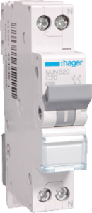 Hager MJN C-Karakteristiek 1P + N installatieautomaat, inbouwdiepte 70mm, uitschakelkarakteristiek C, 2 polen (totaal), 1 beveiligde polen, nom. (meet)stroom 20A, nom. (meet)spanning 240V, spanningstype AC, nom. isolatiespanning Ui 500V, nom. stoothoudspanning (Uimp) 4kV,