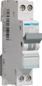 Hager MKN B-Karakteristiek 1P + N installatieautomaat, inbouwdiepte 70mm, uitschakelkarakteristiek B, 2 polen (totaal), 1 beveiligde polen, nom. (meet)stroom 16A, nom. (meet)spanning 240V, spanningstype AC, nom. isolatiespanning Ui 500V, nom. stoothoudspanning (Uimp) 4kV,