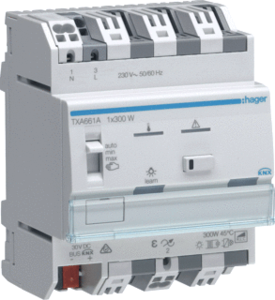 Hager dimactor bussysteem, DRA (DIN-rail adapter), bussysteem KNX, beschermingsgraad (IP) IP20, uitvoering besturingsmodule, type belasting universeel, 1 uitgaande lijnen, uitgangsvermogen 300W, busaansluiting incl., frequentie 50 - 60Hz, breedte in module-eenheden 4, manuele bediening,
