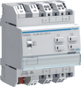 Hager jaloezie-actor bussysteem, DRA (DIN-rail adapter), busaansluiting incl., bussysteem KNX, manuele bediening, beschermingsgraad (IP) IP20, max. aantal jaloezie-uitgangen 4, met LED indicatie, max. schakelvermogen 1200W, breedte in module-eenheden 4, schakelstroom ohms 6A, energiebesparend,