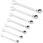 Set van 7 ringsteeksleutels met vork en oog onder een hoek van 15° voor een betere bereikbaarheid. Ratelmechanisme om tijd te besparen door de sleutel niet te hoeven verplaatsen. Dankzij het omkeersysteem hoeft de sleutel niet te worden omgedraaid voor het vast- en losdraaien. Compacte koffer voor gemakkelijk opbergen en bekijken van sleutels. Matte verchroomde afwerking voor betere corrosiebestendigheid.